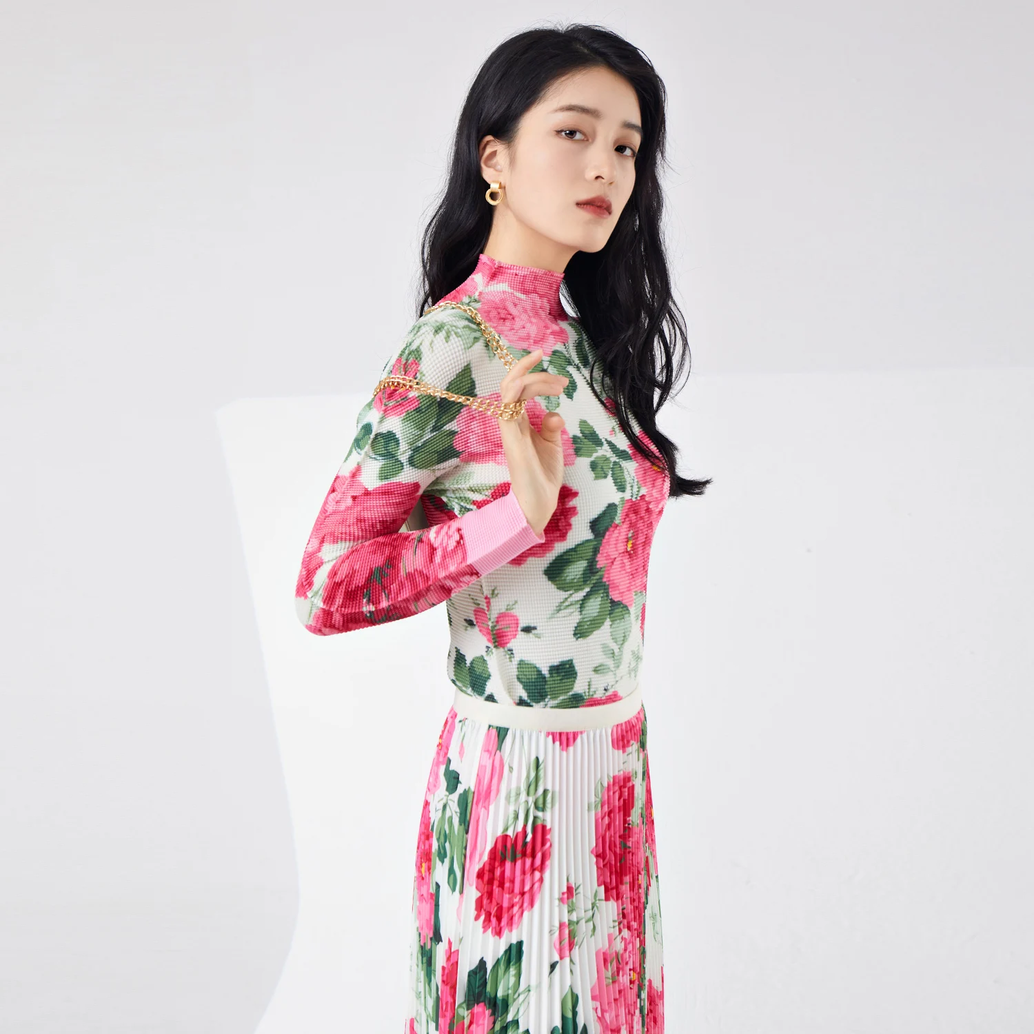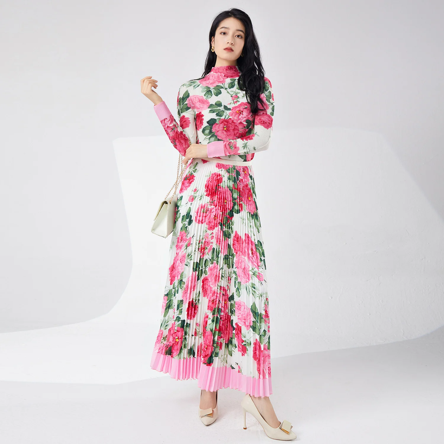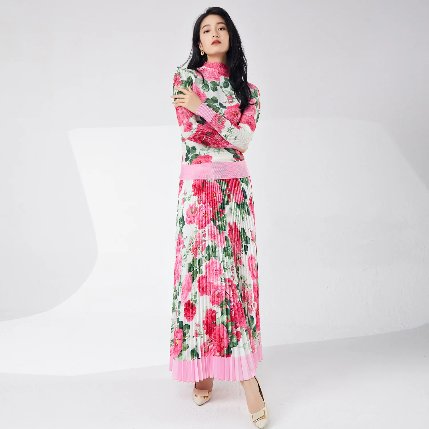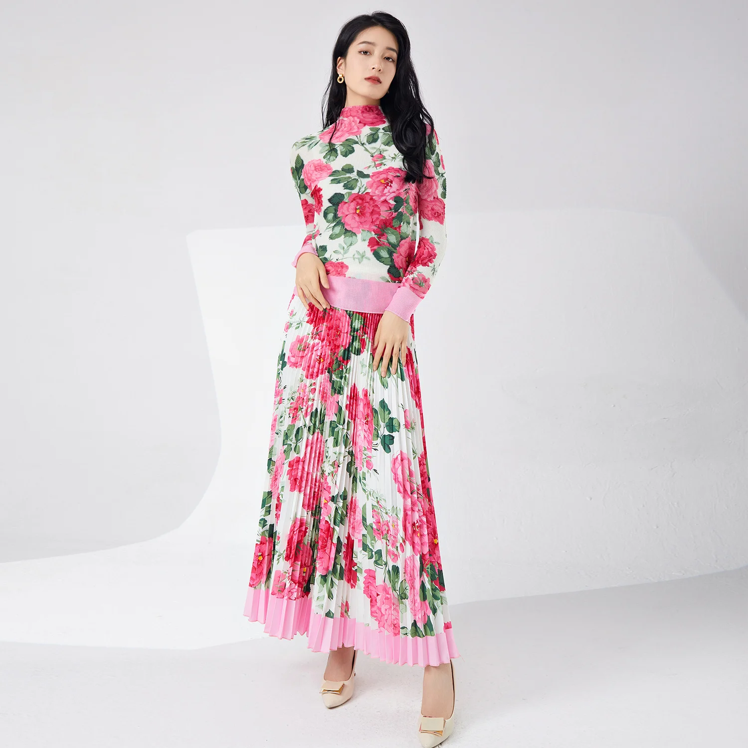 Women's High Quality Elegant Stretch-Print Two-Piece Set Floral Midi Top Skirt Pleated Casual Summer Dress Made of Polyester